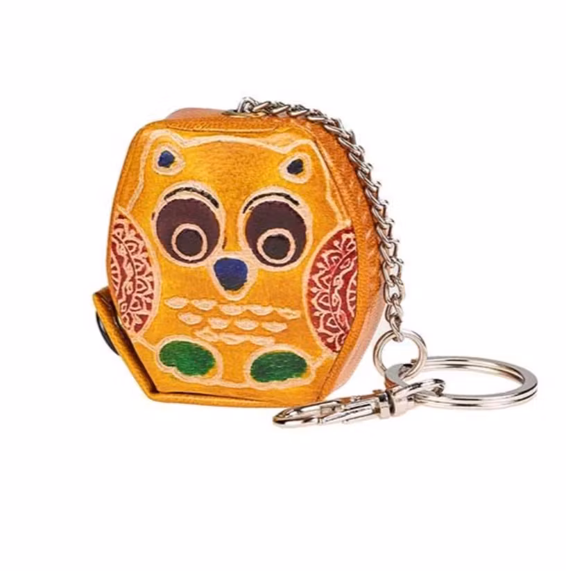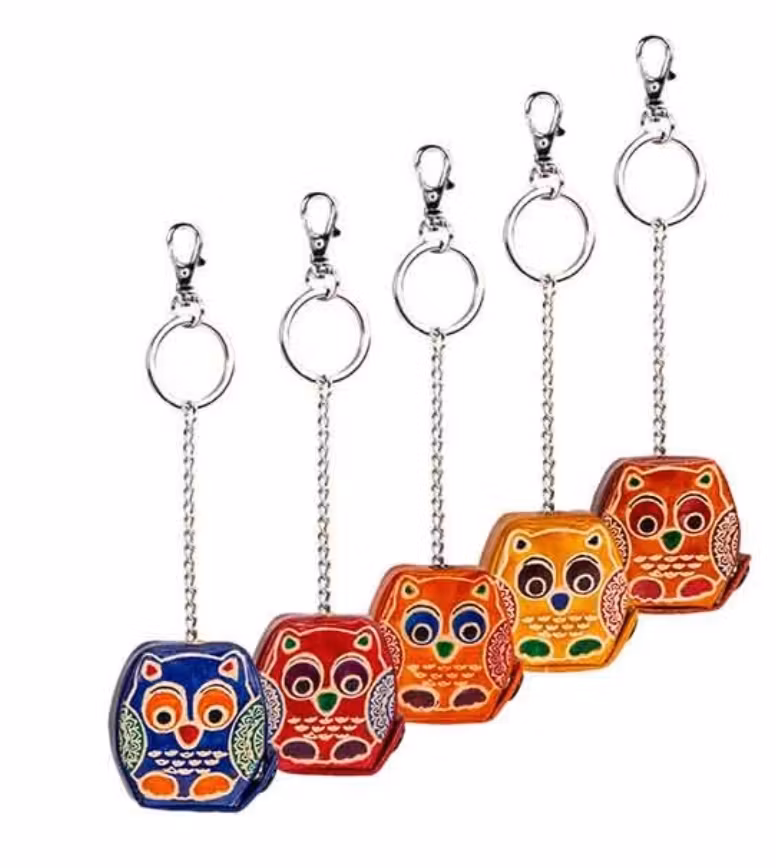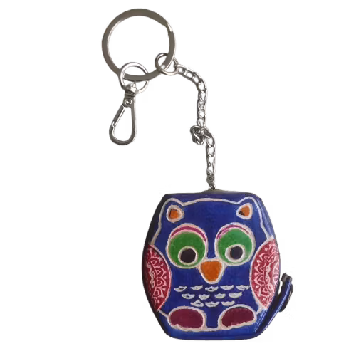 Denna nyckelring eller smycke till väskan ser ut som en liten uggla. Samma motiv/färg finns på smyckets båda sidor och är gjort i traditionell Shantiniketani-teknik. Smycket utmärker sig med en speciell finess: Ett litet fack som öppnas och stängs med en tryckknapp på sidan. Ursprungligen var det nog tänkt till förvaring av småmynt. Idag är det lilla facket perfekt för att förvara exempelvis en pappersbit med adress eller telefonnummer. Fäst nyckelringen sedan på ryggsäck eller väska. Om det blir en present till ett barn, kan du gömma en litern överraskning i minifacket. Barnet själv hittar sedan säkert en och annan småsak eller hemlighet som kan förvaras just där.