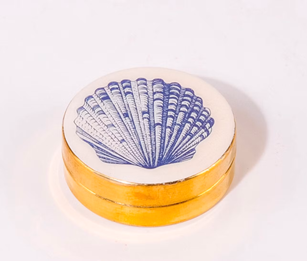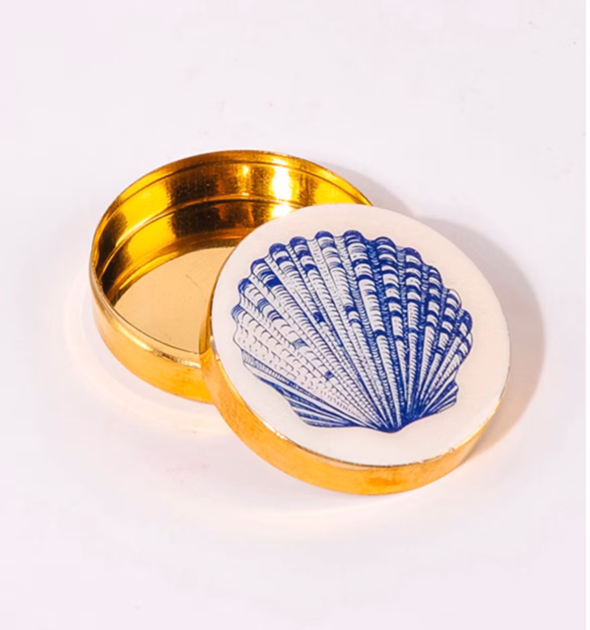 Denna nipperask är liten fin förvaringsask för riktigt små saker som är oumbärliga, älskade eller minnesvärda. Motivet Mussla är tryckt i schablontryck.