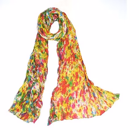 Stor, mjuk och luftig sjal eller scarf i vackra ljusa färger som får dig att längta till eller att njuta av sommaren. Färgspelet påminne rom en blomsteräng och går från grönt dominerande till det mer gula, ungefär som på bilden. Handvävd.