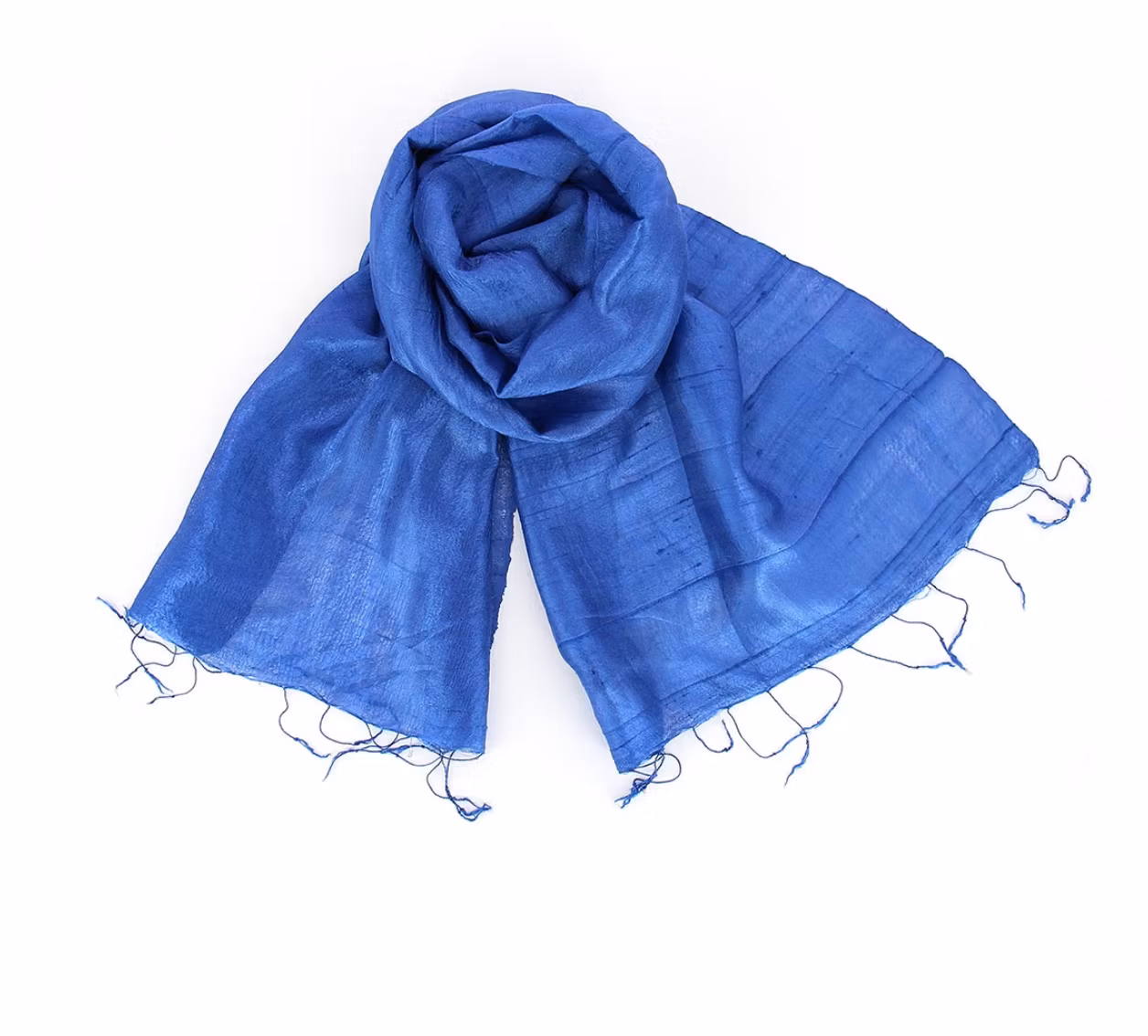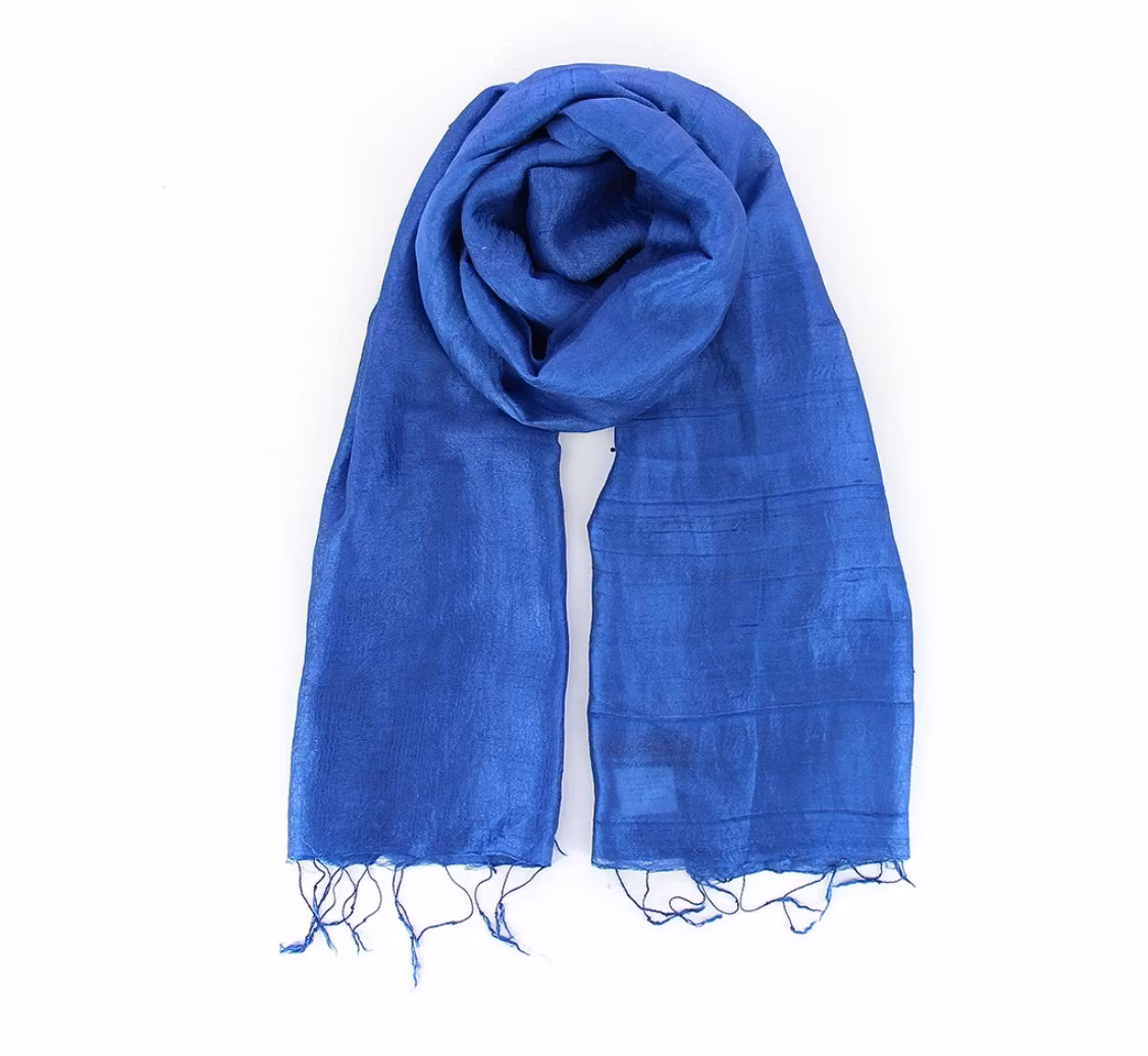 Denna sjal tillverkas i en by i Vietnam, där allt sker på plats: Odlingen av sidenkokongerna, framställning av silkestrådarna, vävningen, växtfärgningen och slutligen förpackningen för transport.
