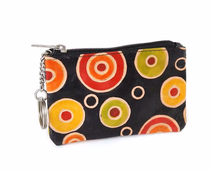 Detta lilla läderfodral eller etui, extra praktiskt med två fack, ett större fack och ett litet. Detta ger plats för nycklar, som kan fästas i det större facket, och hörlurar eller andra småsaker som ofta ska vara till hands och lätta att hitta. Fickorna öppnas och stängs med dragkedja. Fodralet är av läder, dekorationen är handmålade cirklar i olika färger, mot svart bakgrund, ungefär som på bilden. Etuiet är fodrat inuti med ljust tyg.
