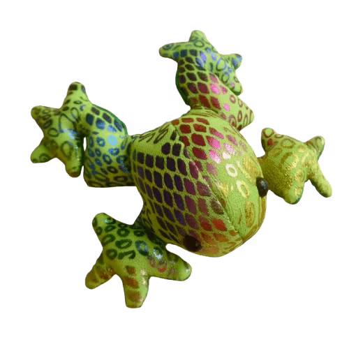 Ett litet sanddjur, en liten grön-gul groda med ett glittrigt mönster. Undersidan är enfärgat grön. Grodan består av tygrester. Det lilla djuret kan bli en fin och annorlunda maskot, present eller leksak. Mönstret på grodorna varierar, bilden visar ett exempel.