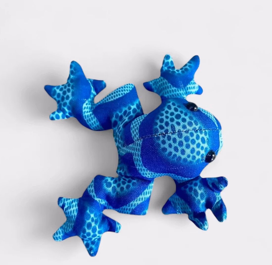Sanddjuret är en stor groda i färg och kamouflagemönster, inte exakt samma som på bilden, mönstret är mer jämt mörkblå med insprängda ljusblå fläckar och svarat prickar. Undersidan är enfärgad klarblå. Stora och små grodor fascinerar, även om de kanske även kan skrämma något när de är så stora här, nästan 15 cm, och drygt 200 g tunga. Sanddjuret passar som present till alla som gillar grodor. Sanddjuren görs av tygrester, därför ser varje groda lite annorlunda ut. Som fyllning används steriliserad sand.