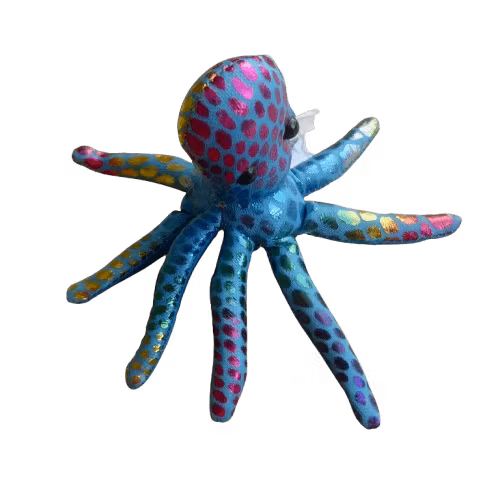 En liten bläckfisk i blått med glittrande prickar, ungefär som på bilden. Det lilla djuret kan bli en speciell maskot, present eller prydnad. Mönstret varierar, bilden visar ett exempel. Undersidan är enfärgad i fin blå färg. Bläckfiskar tillhör blötdjuren, men den här avskyr vattnet, det är sanddjur som trivs enbart på det torra.