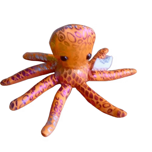 En liten bläckfisk i orange med glittrigt kamouflagemönster, ungefär som på bilden. Det lilla djuret kan bli en speciell maskot, present eller prydnad. Mönstret varierar, bilden visar ett exempel. Undersidan är enfärgad i fin orange färg. Bläckfiskar tillhör blötdjuren, men den här avskyr vattnet, det är sanddjur som trivs enbart på det torra.