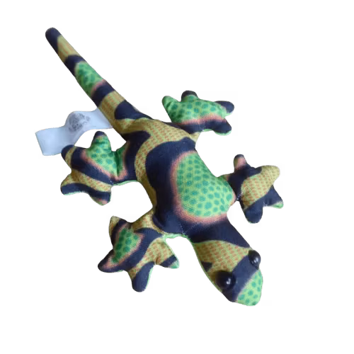 En liten sandödla i ljusblått med ett svart sicksackmönster och gröna prickar, ungefär som på bilden. Den lilla ödlan kan bli en fin och annorlunda maskot, present eller prydnad. Mönstret varierar, bilden visar ett exempel. Undersidan är enfärgad i fin ljusgrön färg.