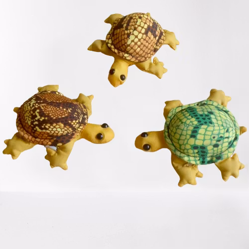 En liten sköldpadda i gul-bruna eller gul-gröna färger, som på bilden. Undersidan, kroppen, i klargul färg. Sköldpaddan är sydd av tygrester och fylld med finsand (kvartssand), som är steriliserad och därmed fri från eventuella småkryp, bakterier mm. Det lilla sanddjuret kan bli en maskot och originell present.
