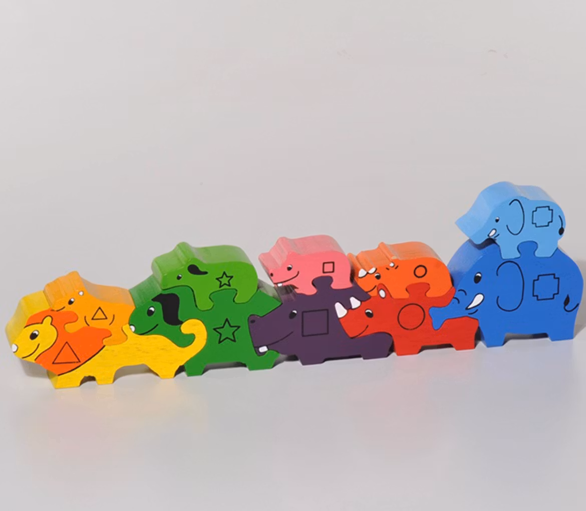 Ett träpussel med fem av Afrikas stora djurarter: Lejon, buffel, flodhäst (eller så är det lilla kusinen till vårtsvinet Pumbaa från disneyklassikern Lejonkungen? Hakuna Matata!) Alla fem djuren är roliga och snälla. Varje djur har sin unge på ryggen. För att underlätta pusslandet har varje djurart ett märke, exempelvis triangel för lejonen, stjärna för bufflarna, osv.