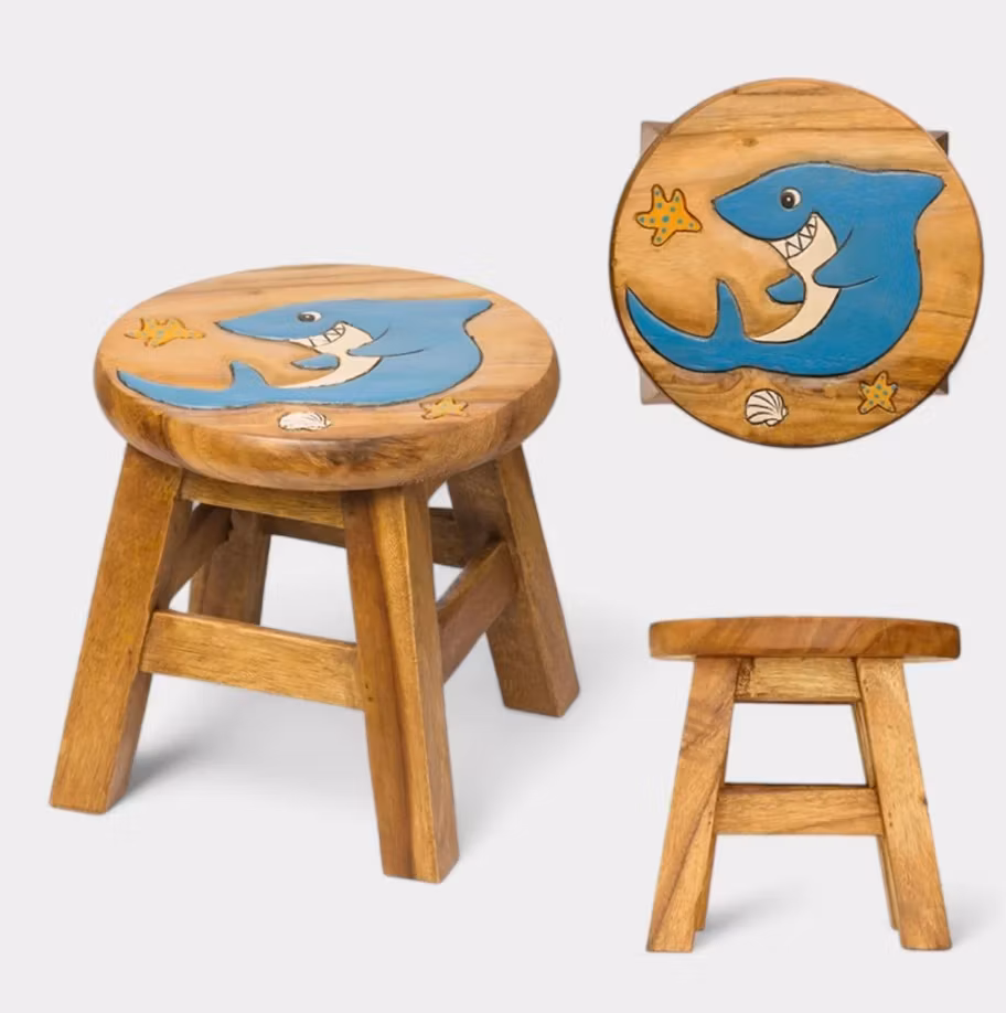 En stabil barnpall i trä med roligt djurmotiv. Pallens ovansida är dekorerad med ett motiv, en haj, som har ristats för hand och målats med akrylfärg. Pallens yta är skyddad med en vaxpolityr. Det är en barnmöbel som passar till barnrummet eller i hallen.