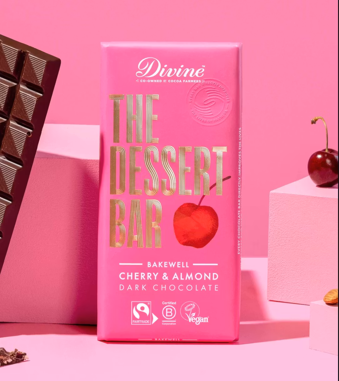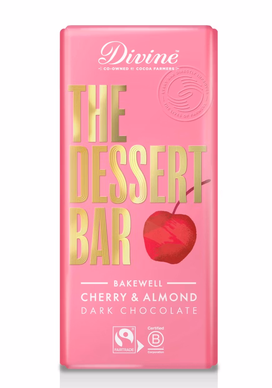 Divine Dessert Bar Cherry & Almond är stor mörk chokladkaka med bitar av sura körsbär och mandel, förfinade med amarettoarom. En efterrätt "without a spoon" som du lätt kan bjuda på. Du sparar förberedelsetid, kanske vill du avrunda med ett litet glas gott dessertvin.