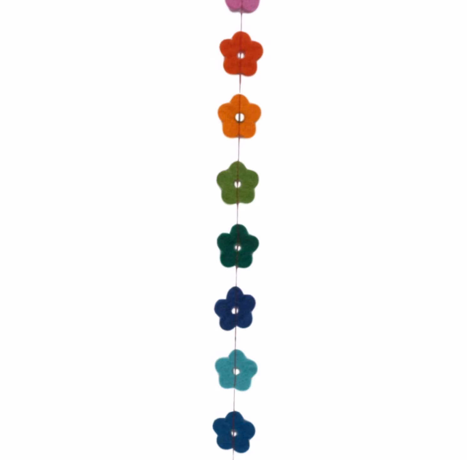 Dekorativ girlang med handtovade blommor i regnbågens alla färger. I ena ändan finns en liten tovad boll som gör att girlangen hänger rakt. Fin dekoration till vardag och fest, i fönstret, mot väggen eller på bordet.