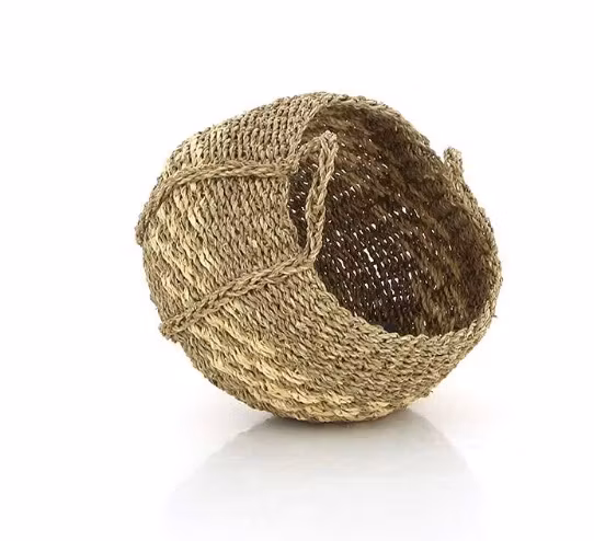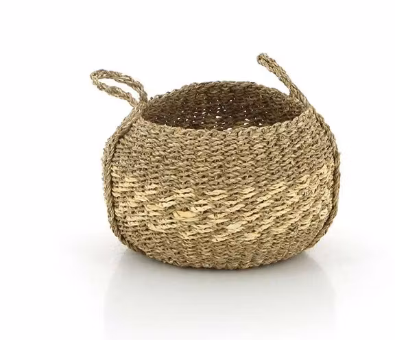 Rund korg med två handtag. Handflätad av tåligt hogla-gräs. Dekorerad med flätade remsor av palmblad, som på bilden. Det är en öppen korg utan lock. Öppningen är lite smalare än mittpartiet. Korgen är praktisk för förvaring av t ex handskar, strumpor, småtvätt eller leksaker mm.