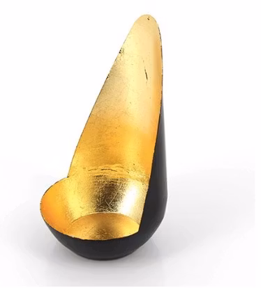 En värmeljushållare av järnplåt. Den musselliknande, i krackelerat guld glittrande ytan reflekterar ljuset fint och skapar en stämningsfull miljö. Passar inne och ute, men ljushållaren gör sig kanske extra fint på altanen eller balkongen. Den pryder sin plats även när ljuset inte är tänt.
