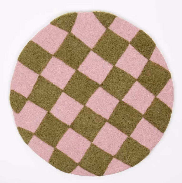 Rund, ljusrosa sittdyna med ett schackbrädsmönster i matchande gröngul. Stolsdynan är i slitstark tovad ull, skönt att sitta på och som lätt kan flyttas runt till olika sittplatser. Kan användas både inne och utomhus. Tovad ull värmer och skyddar för fukt.