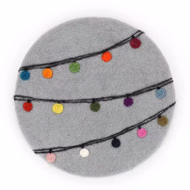 Ett runt grått grytunderlägg i tovad ull med en tovad ljuskedja eller ljusslinga där de små lamporna är underbara färgprickar mot den grå bakgrunden. Underlägget är dekorativt även när det inte används. Undersidan är helt ljusgrå.