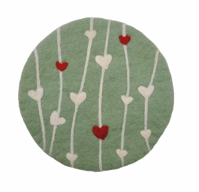Ett runt underlägg i tovad ull till gryta och även kanna. Det ljusgröna underlägget har ett mönster av små hjärtan som på bilden. Det är en vacker dekoration i alla hem. Tre små röda hjärtan sätter en extra dekorativ accent. En fin och praktisk present om du vill visa din uppskattning och ditt tack för den omsorg och omtanke som andra har visat dig.