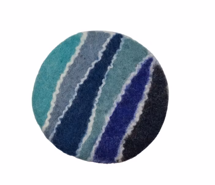 Ett runt underlägg i tovad ull till gryta och även kanna. Underlägget med sitt mönster i zig-zag och dämpade naturfärgkombinationer är en vacker dekoration i alla hem. De blåa nyanserna sätter en extra dekorativ accent.