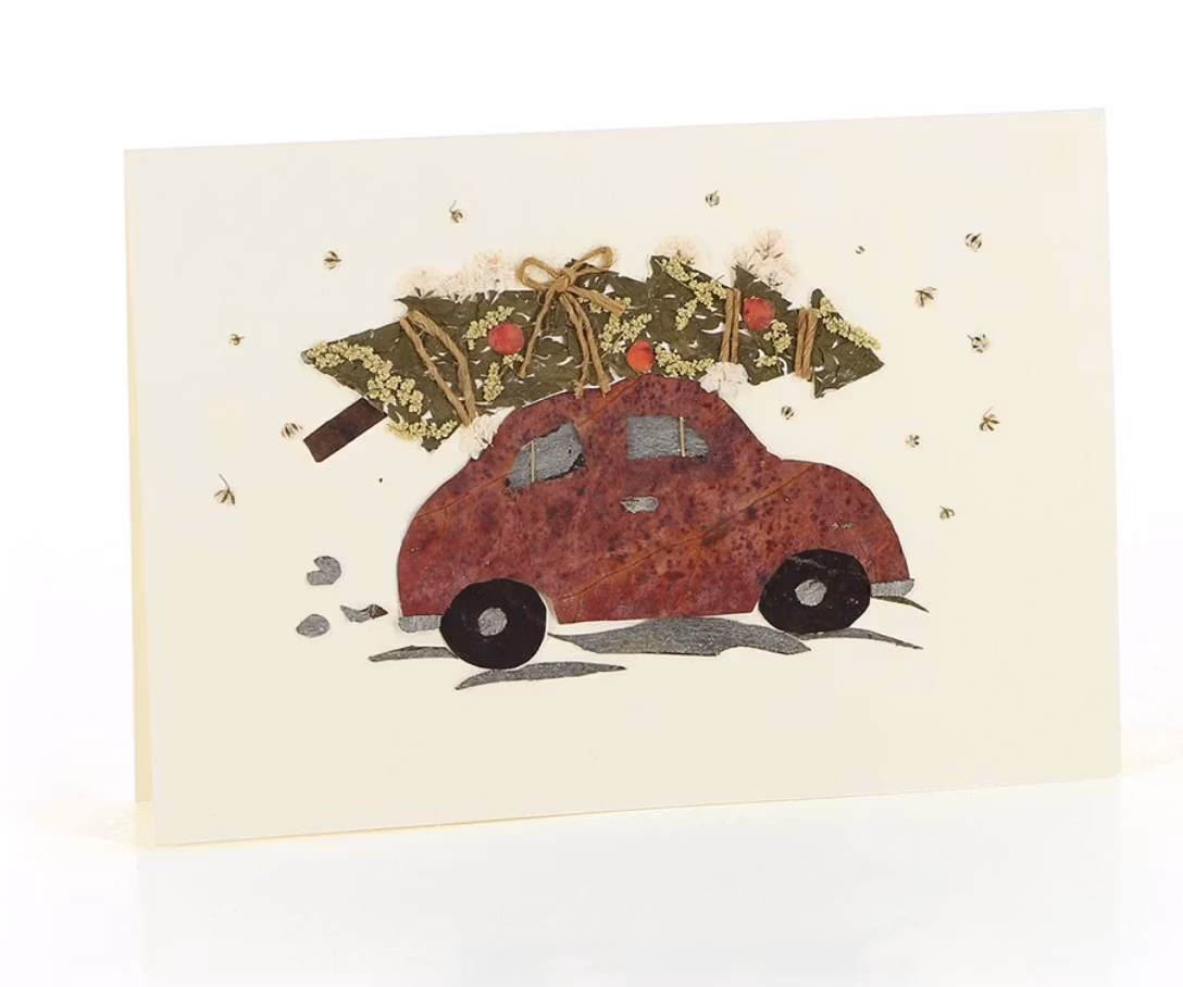 Snart är det jul eller God Jul! Ett dubbelt brevkort av återvunnet, kraftigt papper. Skicka en glad julhälsning med det här roliga motivet, en gammaldags bil som susar fram med en stor julgran på taket. Hela motivet är skickligt handarbete av torkade små, vildväxande blommor, plockade i regionen Comasagua i El Salvador. Kuvertet, som medföljer, har en lätt struktur/textur och samma milda beige färg som kortet.