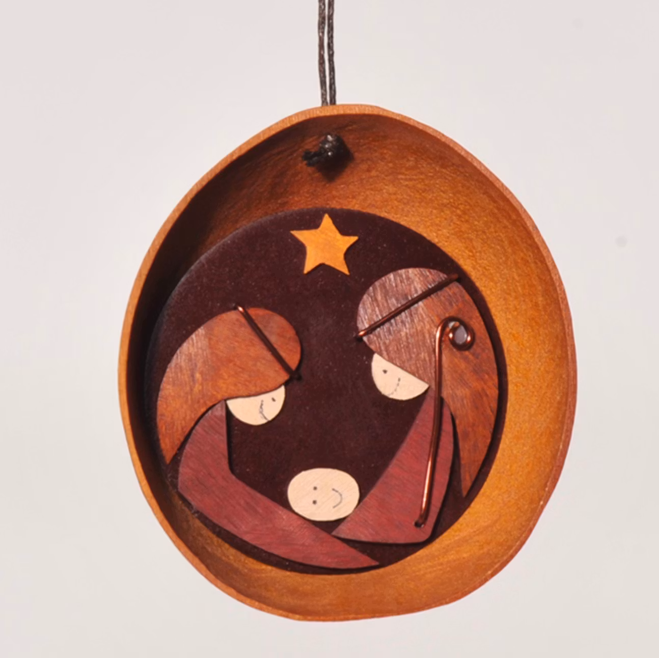 I en kalebasshalva är en mörk kalebasskiva fastlimmad. På denna finns den heliga familjen och en stjärna, Även dessa är gjorda av kalebass och sparsamt dekorerade med mässingstråd, ungefär som på bilden. Upphängningssnöret är av vaxat och tvinnat bomullsgarn. Kalebassen med sitt motiv är en fin kristen symbol, inte bara till jul.