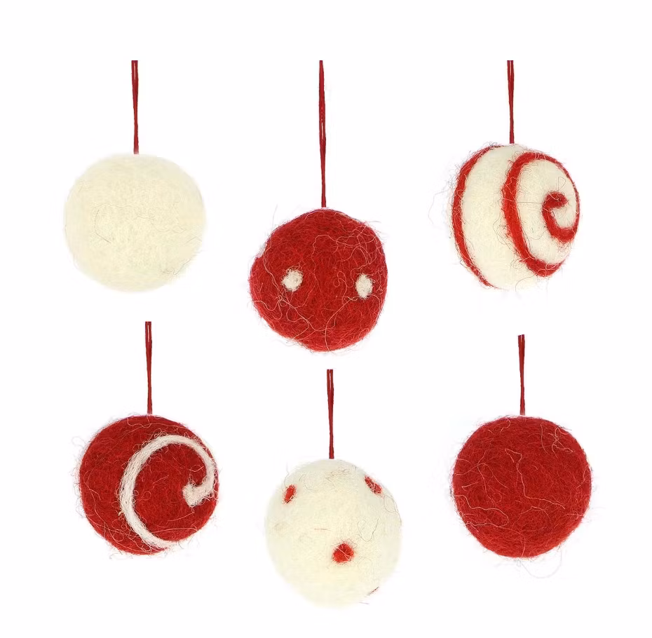 6 stycken små tovade bollar i julklassiska röd-vita färger och med olika mönster. En passande dekoration i julgranen eller rolig detalj på julpresenterna.