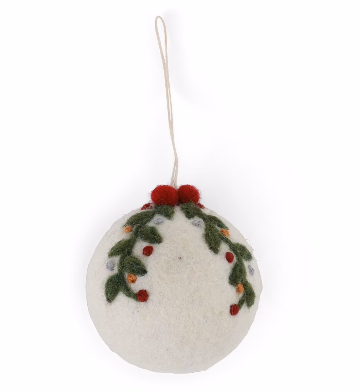 Dekorativ tovad julkula till julgranen. Den vita kulan är vackert dekorerad med gröna kvistar samt röda och gula små prickar, som på bilden. Tovade kulor kan inte gå sönder, de är lätt att fästa på granen och enkla att förvara när julen har dansats ut.
