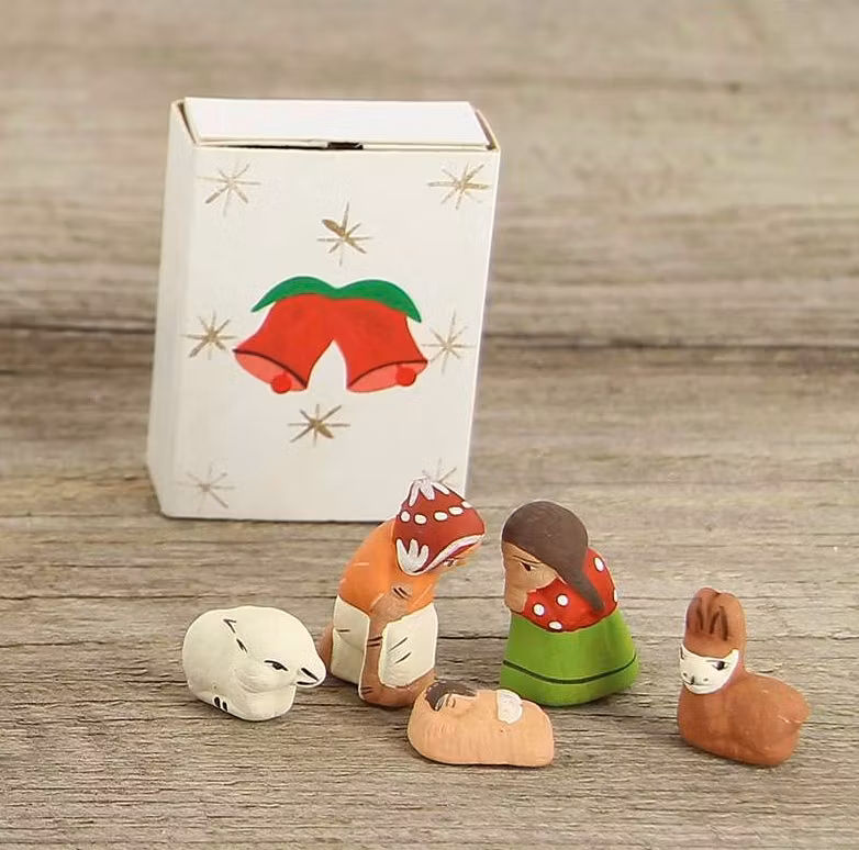 Hela den lilla julkrubban får plats i en ask som är lika stor eller liten som en vanlig tändsticksask.. Maria och Josef knäbojer och i krubban finns det lilla Jesusbarnet. Julgruppen är gjord i Peru, därför ersätts åsnan av ett lamadjur och Josef bär den traditionella mössan med öronlappar. Alla figurerna är av keramik, Maria och Josef är gjorda i halvformat. Asken öppnas/stängs på samma sätt som en tändsticksask. På framsidan är asken kärleksfullt dekorerad med ett stjärnfall eller ett par julglockor. En fin liten gåva till jul.