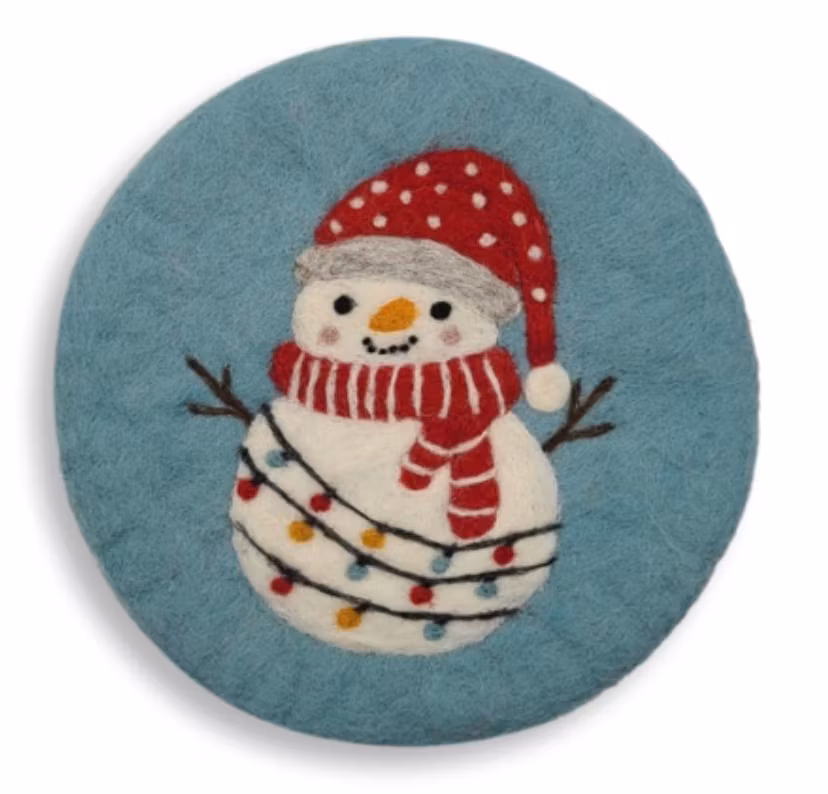Ett runt underlägg till gryta och även kanna som passar perfekt vintertiden. Det tovade motivet är en glad snögubbe med vitprickig röd mössa och en ljusslinga runt magen.