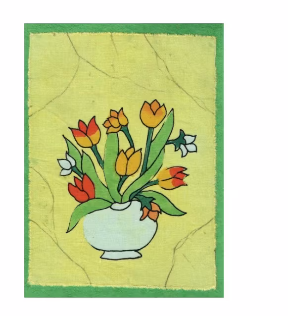 Efter vinter blir det vår! Skicka en glad hälsning med en bukett tulpaner. Är även ett fint motiv till en påskhälsning, om påsken inte infaller alltför sent och om du inte favoriserar påskhare eller påskägg som motiv. Handgjort papper med batikteknik på tunt tyg. Skriv dina påskhälsningar på ett vanligt ark papper och lägg in i brevkortet.