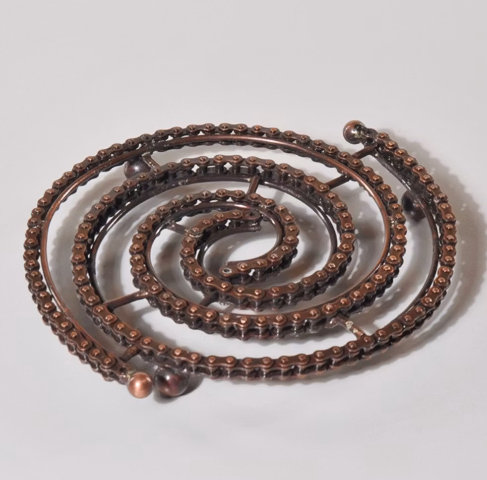 Ett stabilt och mycket tåligt grytunderlägg, gjort av en cykelkedja i vacker bronsliknande färg. En praktisk och ovanlig present!