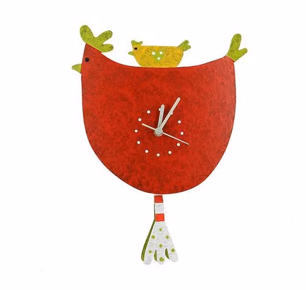 Väggklockan eller vägguret med pendel är ett litet konstverk av återvunnen metallskrot. Det är ett välgjort exempel för kreativt återbruk, upcycling. Klockan har formen av en tjock röd höna som bär en liten kyckling på ryggen. Hönans ben pendlar i sekundernas takt.