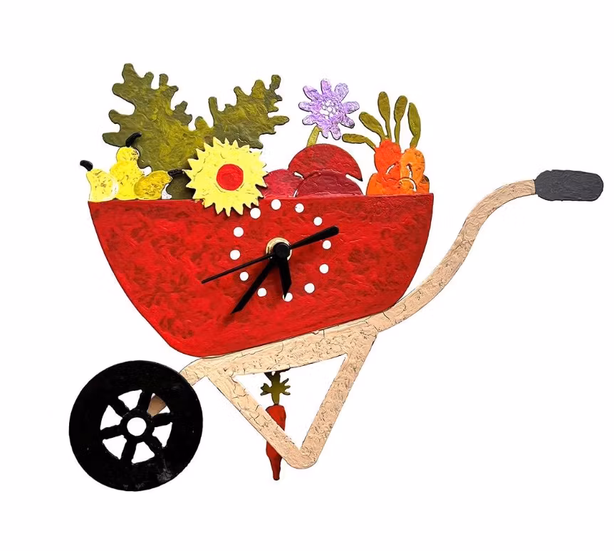 En skottkärra har blivit modell för en väggklocka eller väggur med pendel. Allt är gjort av återvunnen metallskrot: Karet, som är fyllt med grönsaker, frukt och blommor, samt skalmen, hjulet, handtagen och stödet. En morot har hamnat lite utanför och pendlar i sekundernas takt. Skottkärran, en "rullebör" på skånska och "hylebaur" i Halland, liknar inte precis modellen Ekeby. Det lilla konstverket är ett välgjort exempel på kreativt återbruk, upcycling.
