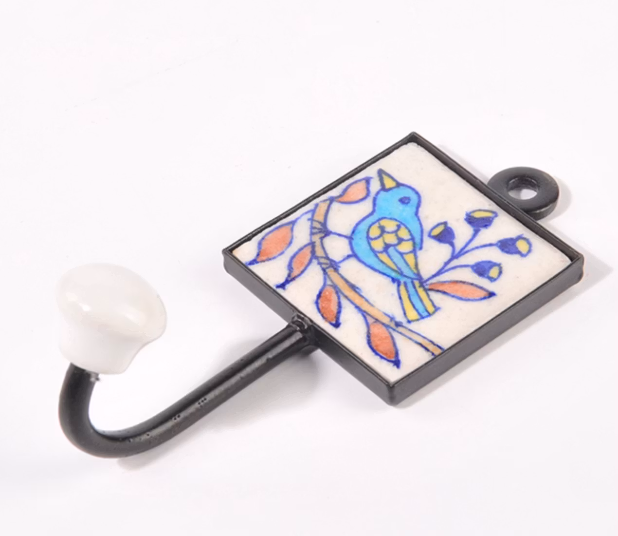 Praktisk, rejäl och mycket dekorativ är denna väggkrok. Kläder, tygkassar, grytlappar, prylar, i hallen, köket, rummet - överallt där väggförvaring behövs passar denna krok till mycket och på många ställen. Den vita keramikknoppen är en extra fin detalj. Krokarna är handmålade, små avvikelser i färg och mönster förekommer.