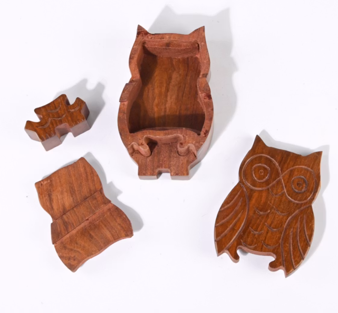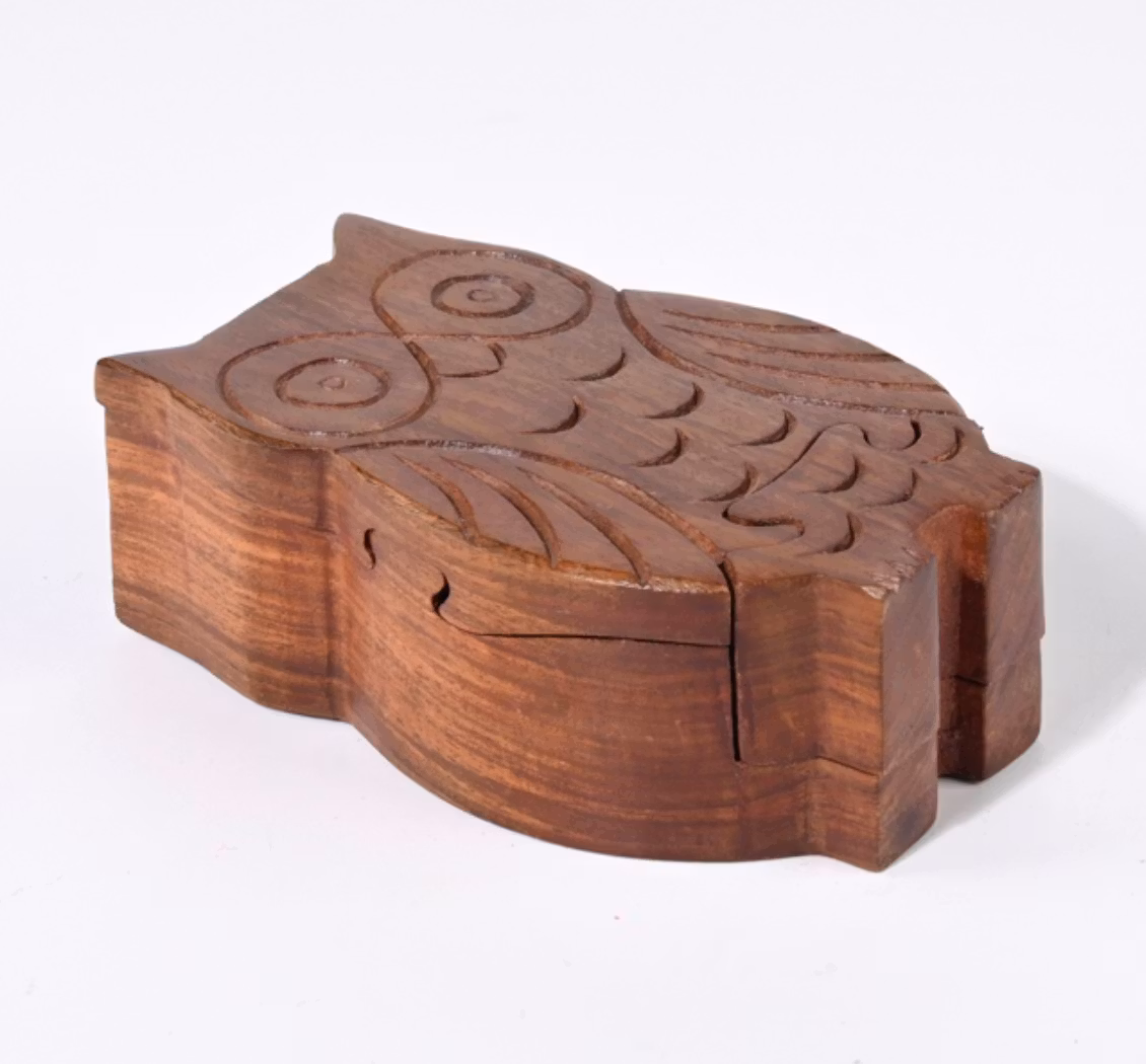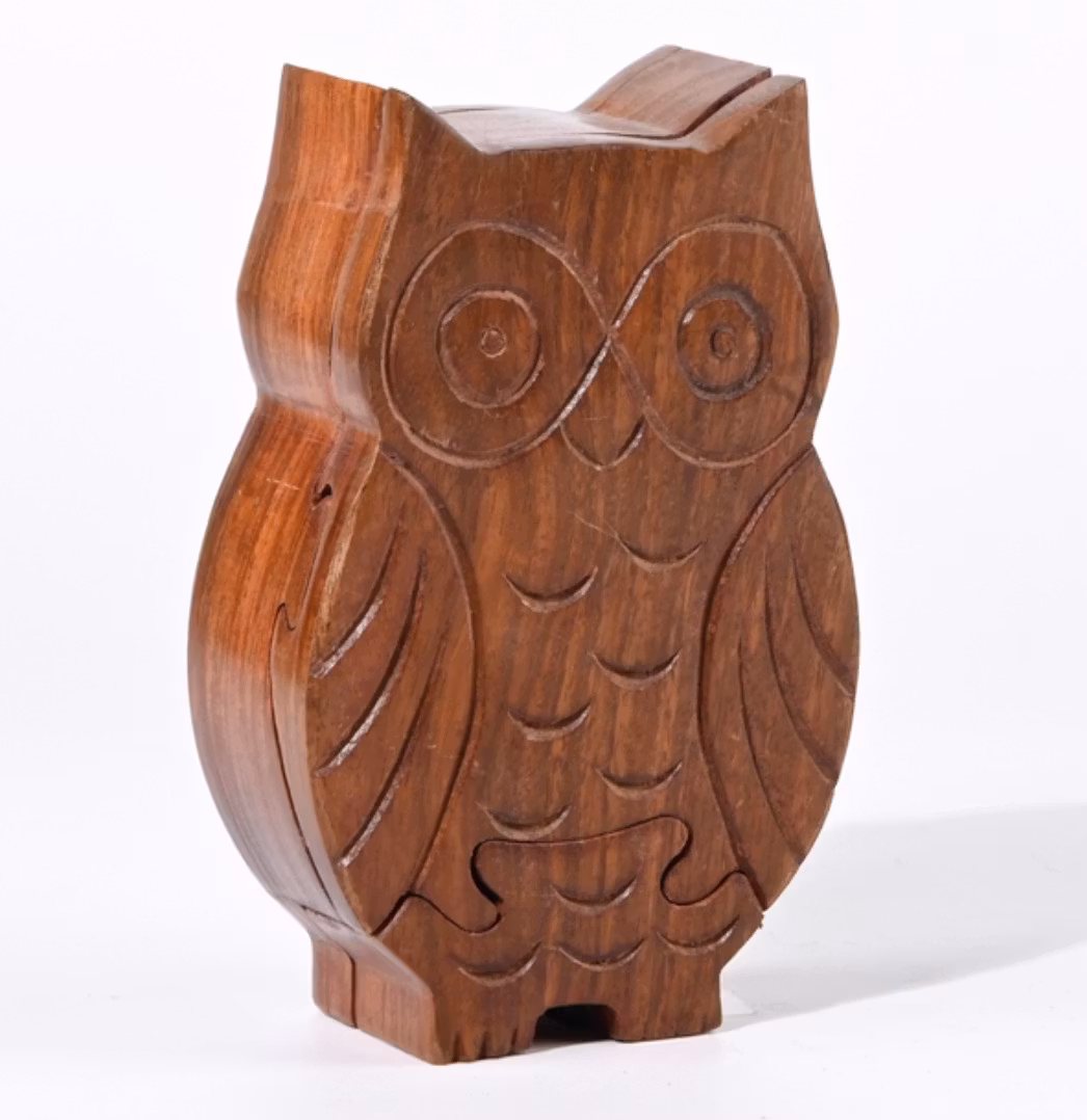 En liten, välsvarvad träask, formad som en uggla. Denna spännande ask består av fyra delar och är lagom klurigt att öppna. Därför är detta en klok uggla, mycket lämpad att förvara och dölja kära eller hemliga småsaker i. Ugglan blir som en hemlig skattkista, och är dekorativ när den inte är öppnad.