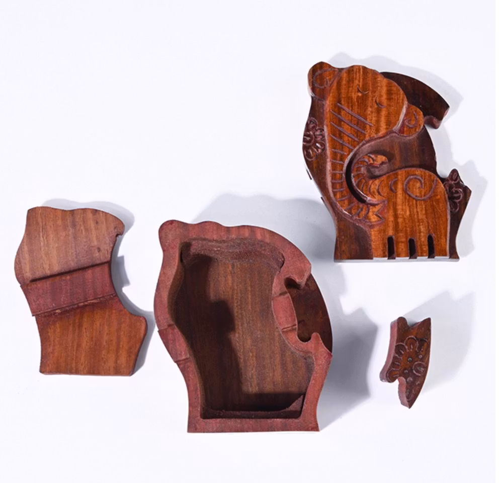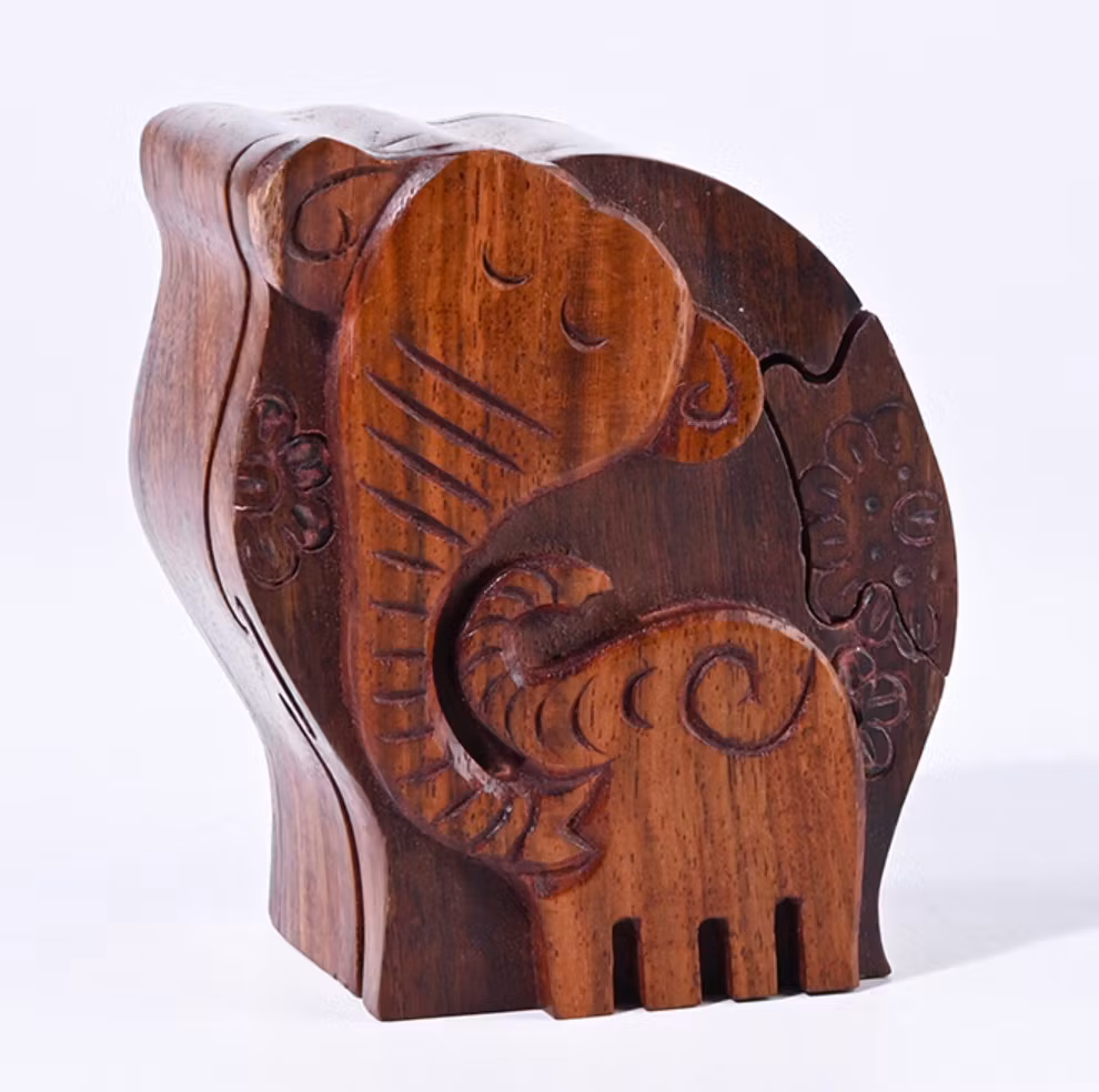 En liten, välsvarvad träask, formad som en elefant med sin unge. Denna spännande ask består av fyra delar och är lagom klurigt att öppna. Därför är asken mycket lämpad att förvara och dölja kära eller hemliga småsaker i. Elefanterna är en fin liten dekoration, när asken inte är öppnad.