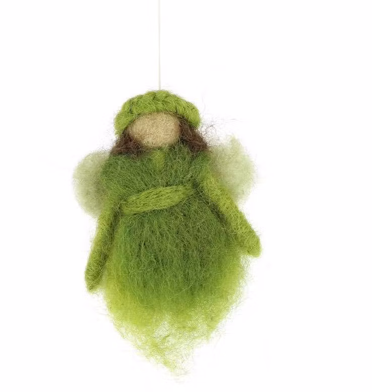 En liten glad och god fe eller ängel eller kanske älva eller skyddsängel i grön färg med flätat hår och med vingar i ljusgrönt. En dekorativ sagofigur eller fantasifigur som är dekorativ i på många ställen. Även fin som maskot. På huvudet finns en ögla av ett tunt snöre för upphängning. Handtovad, ullen är färgad med miljövänliga färger. Den goda fen är även en fin dekoration på presenter.