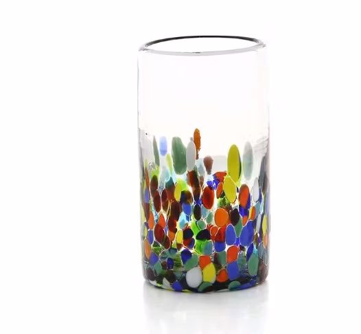 En munblåst vas av återvunnet glas, och med ett mönster på ytan som påminner om konfetti som tillhör många glada fester och högtider. Det ovanliga mönstret är skapat av smälta glaspärlor med hjälp av en smältningsteknik som kräver stor skicklighet. Vasen är en fin dekoration utan att avleda blicken från blomsterbuketten.