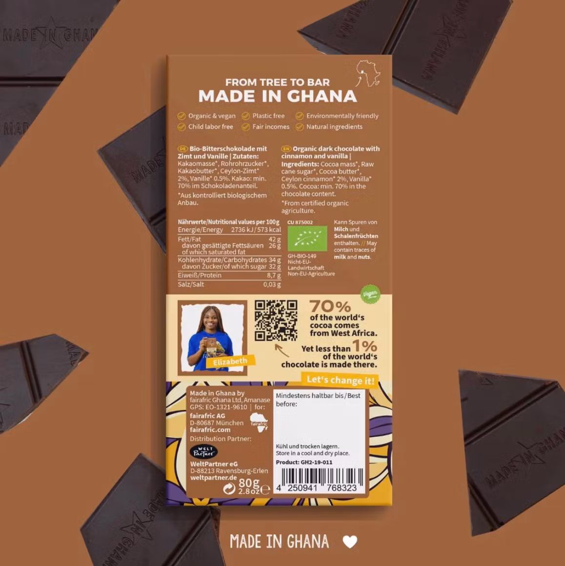 - Ursprung: Ghana (kakao), Mocambique (rörsocker)