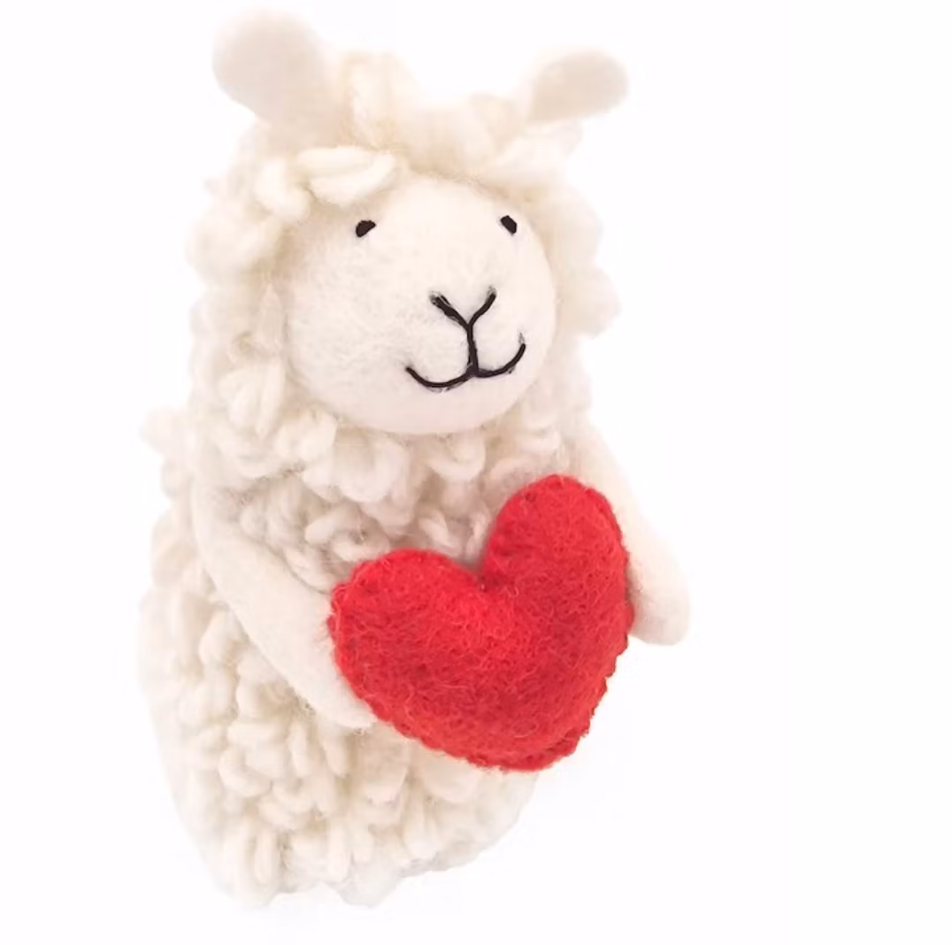 Det tovade fåret med sin ulligt-krulliga päls och sin vänliga uppsyn bär med en kärleksfull gest på ett rött hjärta. En present med hjärta, helt enkelt. Ge den till en hjärtevän eller som rolig present på alla hjärtans dag. Det blir en present som får mottagaren att le. Det lilla djuret är en utmärkt äggvärmare och kan även vara en handdocka, maskot.